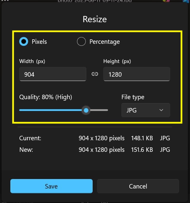 4. Klik Save untuk menyimpan salinan foto yang sudah disesuaikan resolusinya