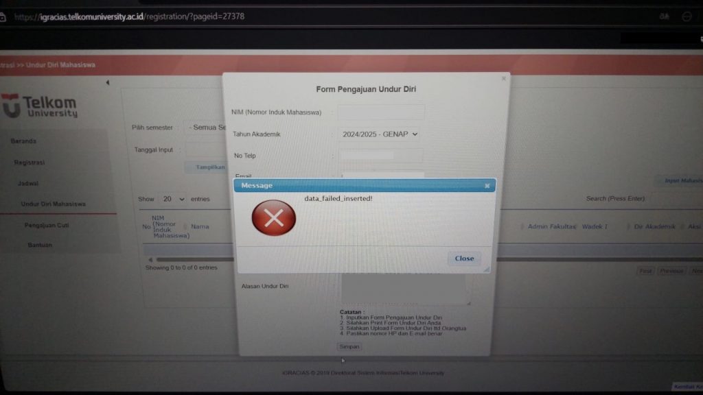Jika Anda terkendala dalam mengajukan undur diri melalui iGracias dengan notifikasi, “data_failed_inserted!”, silakan dicoba: