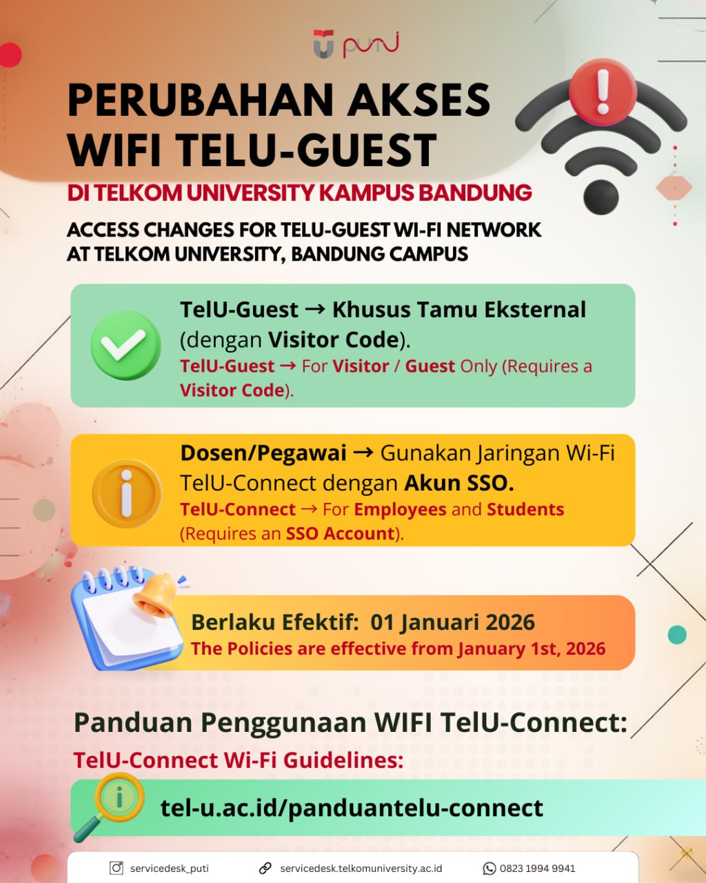 Sehubungan dengan upaya peningkatan keamanan dan optimalisasi layanan jaringan di Telkom University Kampus Bandung, kami sampaikan informasi penting mengenai perubahan akses Wi-Fi: